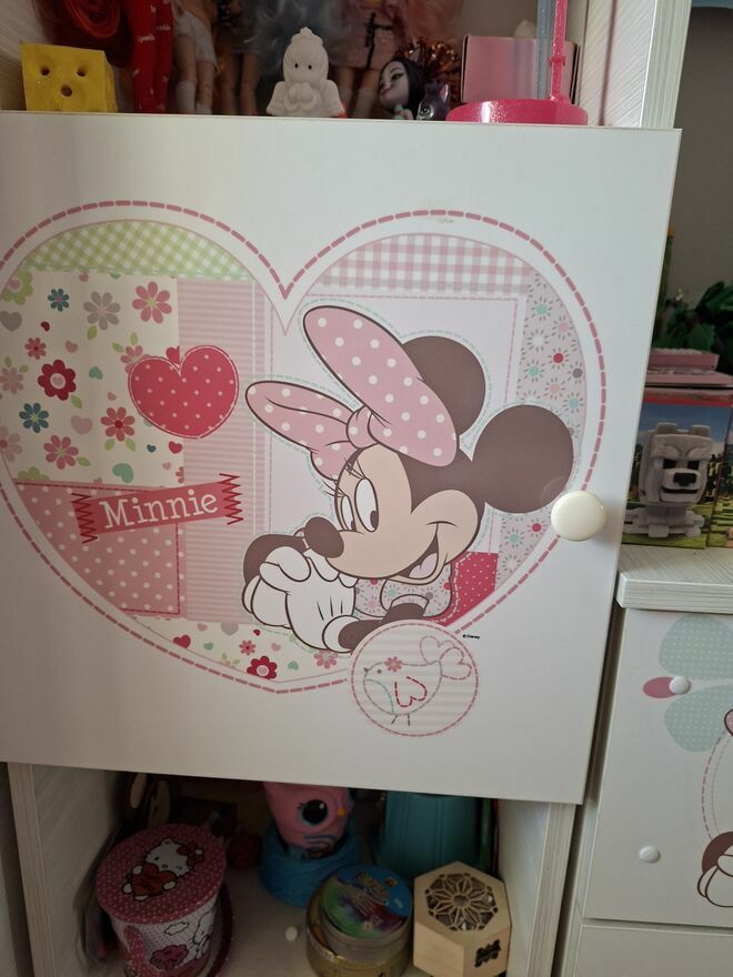 Na frontach mebli umieszczone są kolorowe nadruki, można bez obaw myć je ściereczką. Nadruki zabezpieczone są specjalnym laminatem, aby zapewnić mu trwałość i zapobiec przed wycieraniem się obrazka.
