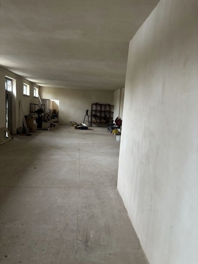 Wysokie, jasne pomieszczenia (wys. > 3,3 m), czysta posadzka betonowa, układ z dużą salą główną oraz kilkoma pomieszczeniami pomocniczymi (biuro/mała produkcja/zaplecze).