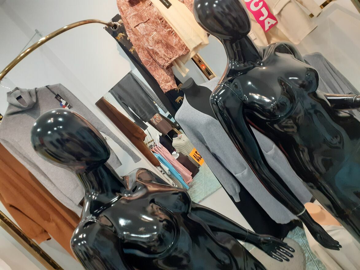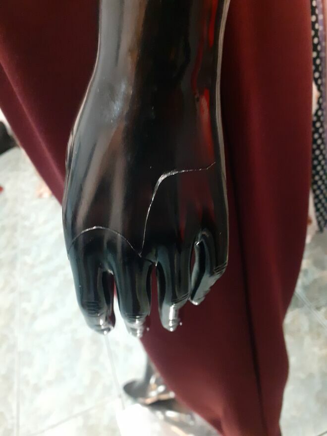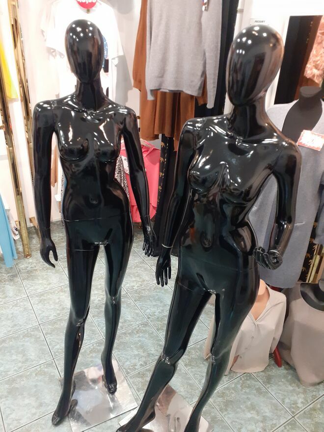 Posiadam dwa manekiny czarny połysk cena za jednego 250zł.Wysokość 184cm szerokość 40cm są w dobrym stanie są widoczne rysy od użytkowania widoczne na zdjęciu. Dłonie miałam przyklejone taśmą dla bezpieczeństwa.