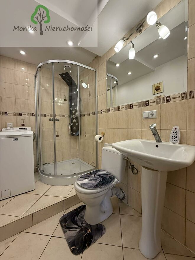 * łazienki z WC wyposażonej w nową kabinę prysznicową oraz prawie nową pralkę.