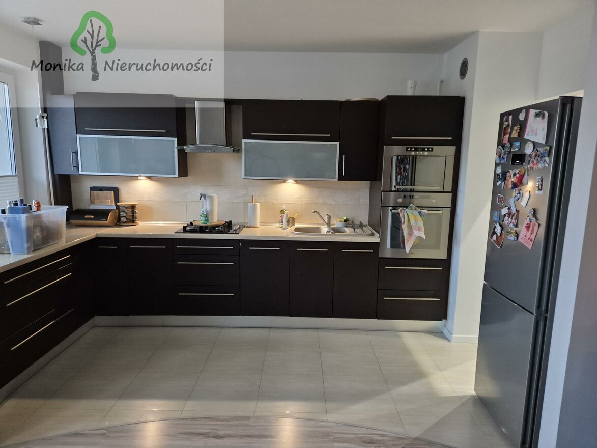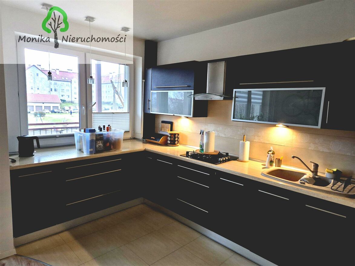 - Salon z aneksem kuchennym z zabudową na wymiar i sprzętem AGD oraz duży balkon z widokiem na plac zabaw.