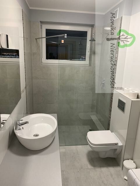 - Łazienka z oknem, wyposażona w kabinę prysznicową oraz pralkę