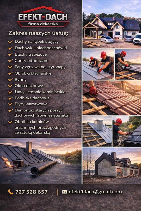 Zakres naszych usług: dachy na rąbek, dachówki i blachodachówki, blachy trapezowe, gonty bitumiczne, papy zgrzewalne, styropapy, obróbki blacharskie, rynny, okna dachowe, ławy i stopnie kominiarskie, podbitka dachowa, płyty warstwowe, demontaż starych poszyć dachowych, również eternitu, obróbka kominów oraz innych prac, zgodnych ze sztuką dekarską. Wieloletnie doświadczenia, profesjonalizm, darmowa wycena, terminowość. Zapraszamy do kontaktu 727 - pokaż numer telefonu - , @Sprawdź zainteresowanie tym ogłoszeniem