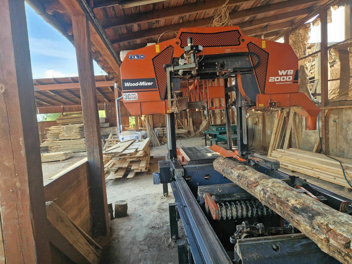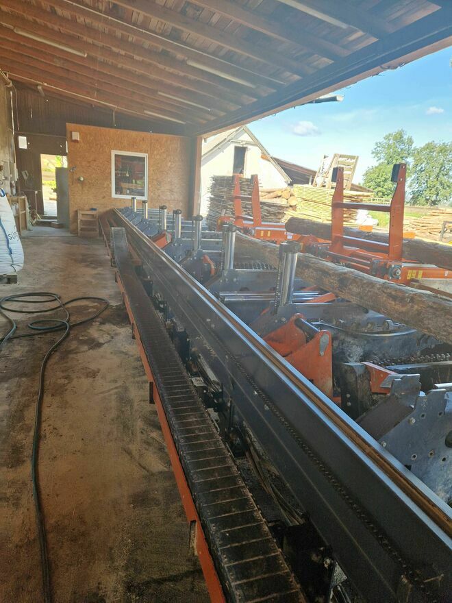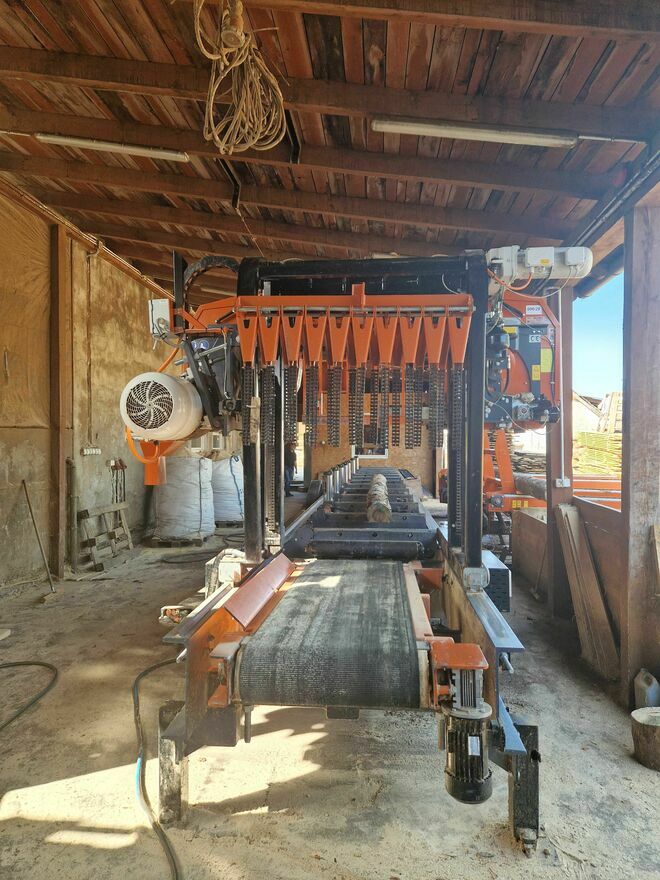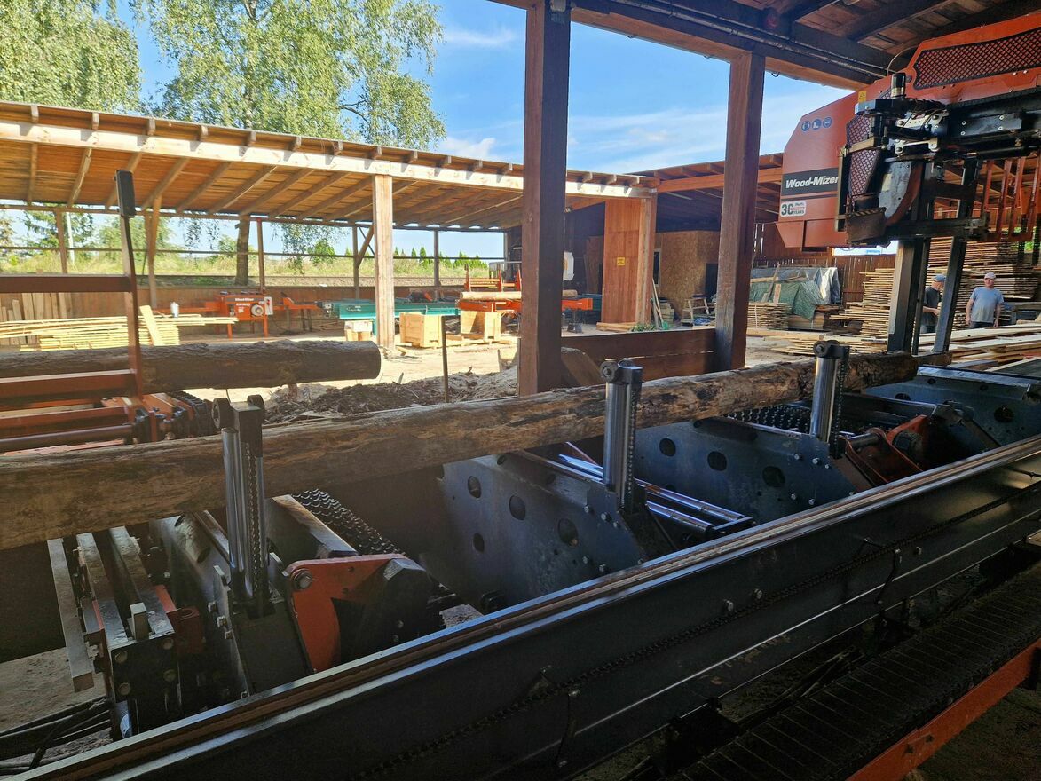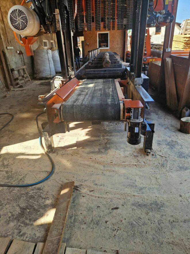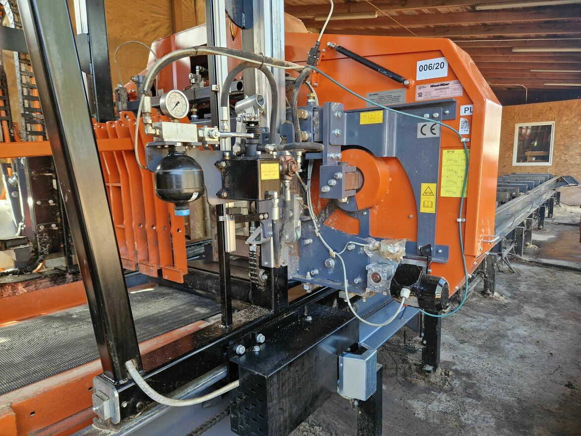 Trak z najdłuższym stołem do cięcia drewna 12,5 m cięcia sterowany joystickami. Ekrany panelowe. Kamery posuwu cięcia piły. Korowarka. Pełna hydraulika. System hydrauliczny napięcia piły. Układ czyszczenia i chłodzenia brzeszczotu obracaki i dociski kłody, również dociski dolne (dociąganie kłody do łoża). Trak w pełni serwisowany przez Wood Mizer. Stoły podawcze kłody. Bardzo dokładne cięcie. Najbogatsza wersja.